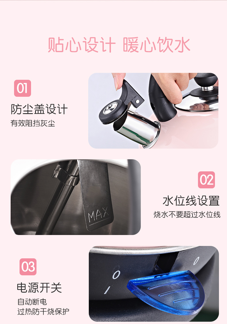 壶嘴上加了防尘罩,有效地防止了异物进入锅内,让您放心